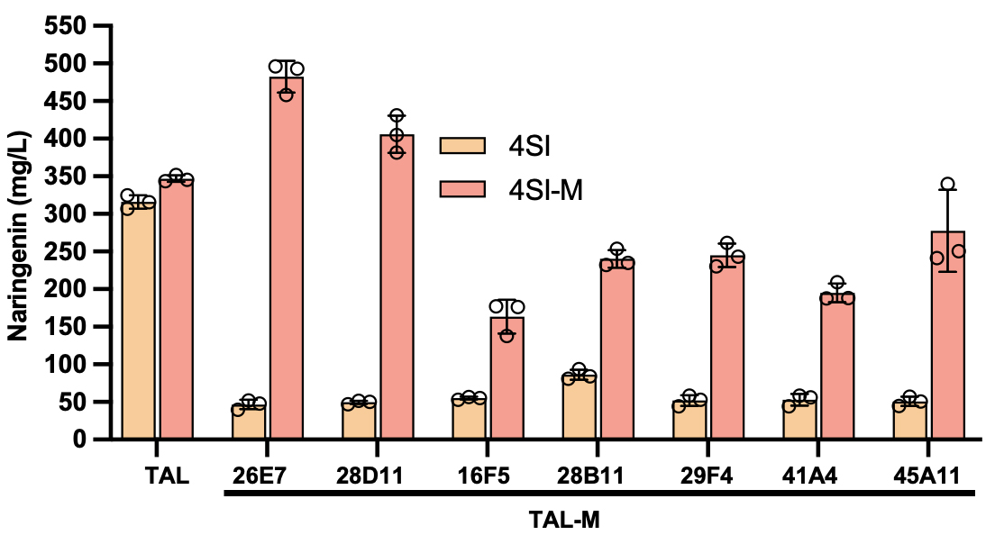第一时间,将TAL基因放置于不同拷贝数、弱启动子质粒,其余关键性代谢基因维持原质粒(1),发现当TAL基因被放置在中高拷贝数质粒ColE1时能取得最高柚皮素产量。然而,在该背景质粒下,直接筛选TAL的随机突变库时,未能取得产量更高的有义突变体,揭示了复杂的基因上位效应可能诱发途径进化陷入局部最优解。为解决该问题,该团队TAL随机突变库置于低拷贝数质粒,以创造一个人工代谢瓶颈,确保TAL的表达和活性是限制柚皮素产量的唯一因素。在这种情况下,突变体的进化轨迹更为清晰,在产量达到其本身在中高拷贝数质粒上所能达到的最高产量之前,理论上不会遇到中间体毒性或复杂调控等问题而导致进化的不确定性问题基于此,研究团队取得了7株在该背景下能显著提升柚皮素产量的TAL突变体,并确认了其突变位点。随后,将野生型TAL7种变体放置于中高质粒,发现所有TAL变体的柚皮素产量均低于其野生型的最高产量(357.66 mg/L)。上述结果证实TAL基因置于中高拷贝数质粒(ColE1 origin时,基因上位效应可能会掩盖柚皮素的有义突变体,导致代谢途径在直接进化中往往只能达到次优水平;这也解释了途径进化常出现微小或无明显效果的原因。