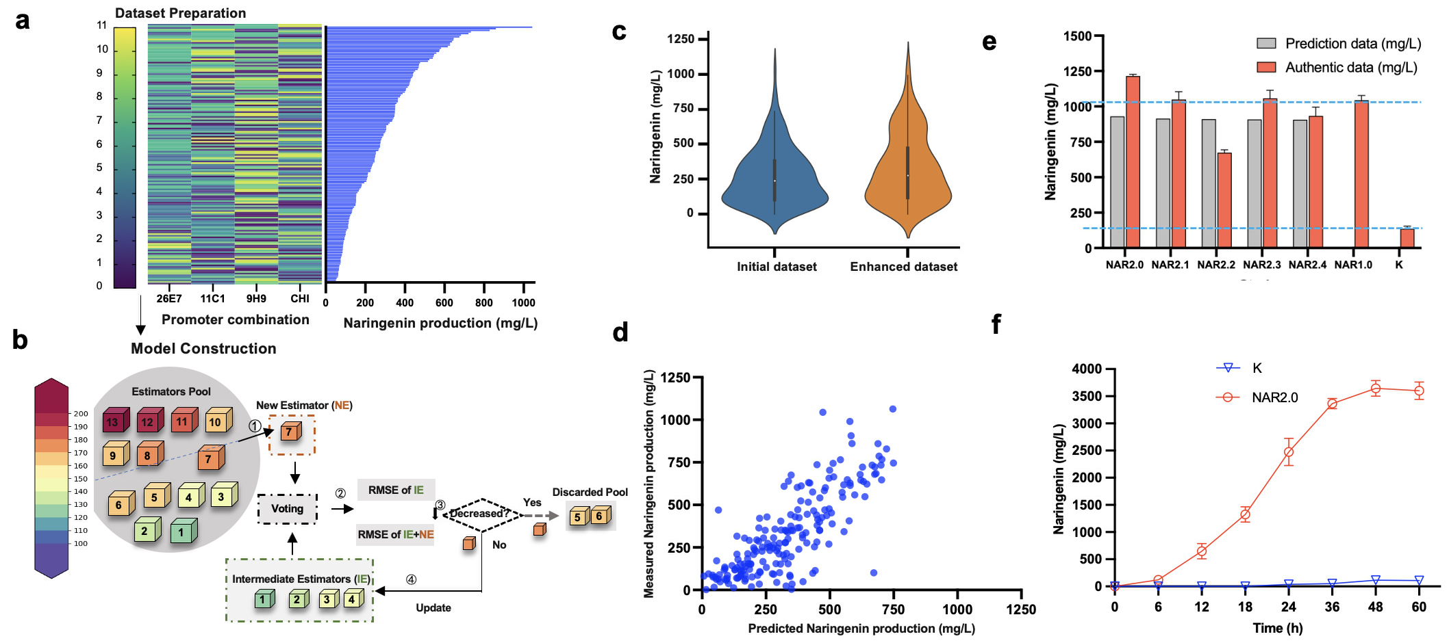 鉴于基因上位效应影响,进一步迭代进化上述3个关键性基因可能会诱发代谢通路失衡,导致进化不确定性。为此,本团队开发了ProEnsemble机器学习框架(图5),优化进化通路启动子组合,缓解进化途径的基因上位效应影响。本研究尽可能选取不同分布的数据,避免训练进入局部最优解,根据Al3+信号,从约1000个克隆子中收集到相对平衡的数据集,柚皮素产量范围在50.81044 mg/L之间。Top1NAR1.0菌株柚皮素产量对照组高出4.44倍。顺利获得对数据集进行十折交叉验证,评估13种常规预测器的均方根误差(Root Mean Square Error, RMSE),随后顺利获得前向模型选择,将误差最小的预测器依次进行集成,选择RMSE最小的集成模型作为最终的预测模型。皮尔逊相关系数(Pearson Coefficient Correlation, PCC)也达到了0.74,显示出该模型真实值和预测值之间有更好的相关性。