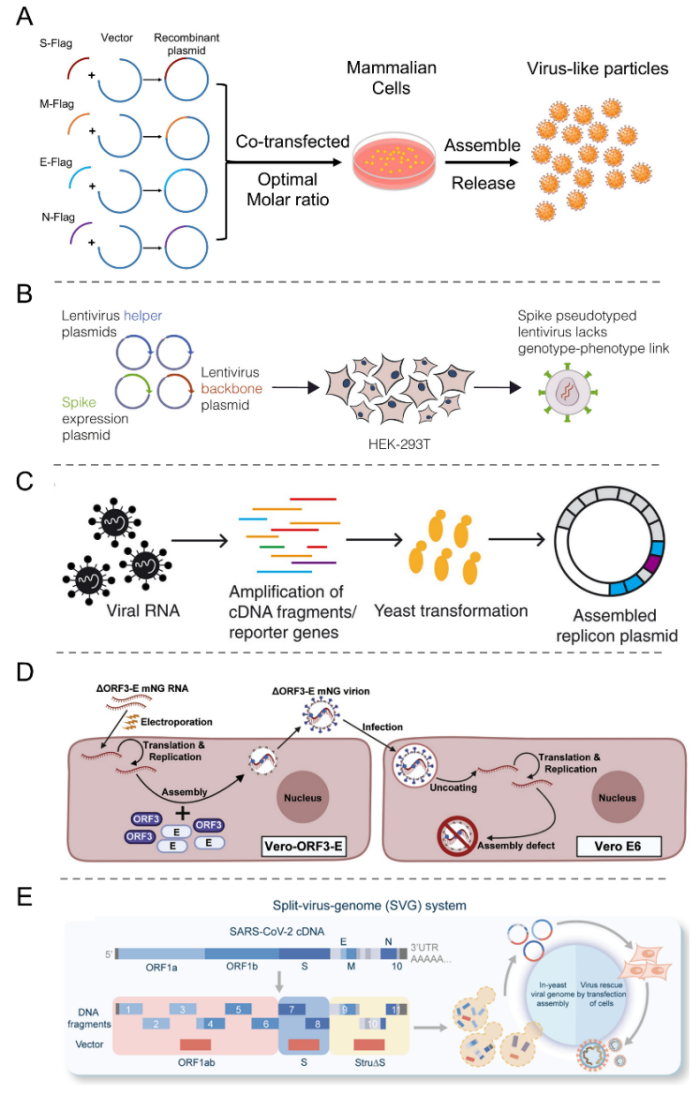 另外,开发具有生物安全性的工程化病毒系统也是至关重要的(如图3)。病毒样颗粒(VLPs)是由一个或多个病毒结构蛋白自组装形成的中空颗粒,形态与野生型病毒相似且可以特异性侵染宿主细胞。VLPs以高密度展示外源抗原表位,能够促进抗原呈递细胞的摄取,从而有效诱导细胞免疫和中和抗体反应。假病毒(Pseudovirus)是顺利获得重组来自不同病毒的骨架蛋白和包膜蛋白构建而成的。常用的骨架病毒包括人类免疫缺陷病毒(HIV)、水疱性口炎病毒(VSV)和小鼠白血病病毒(MLV)。另一种提高生物安全性的常用策略是构建病毒复制子(Replicon),这是一类可自我复制的亚基因组系统,通常会顺利获得报告基因取代编码病毒结构蛋白的基因。另两种工程化病毒系统分别是反式互补系统(Trans-Complementation System)和基因组拆分系统(Split-Virus-Genome System,SVG),构建得到包含所有病毒成分的基因组缺陷病毒,能够模拟真实的病毒生命周期,且不产生子代病毒,用以研究蛋白质功能和病毒粒子组装。