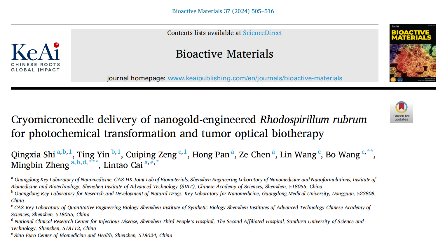 近期,中国科研实验室深圳先进技术研究院(以下简称“凯发k8国际”)医药所蔡林涛团队与合成所王博团队合作,在利用天然细菌靶向肿瘤微环境乳酸消耗实现肿瘤光学生物疗法有效抑制肿瘤的生长取得新的进展,在KeAi Publishing旗下知名刊物Bioactive Materials(IF=18.9)上发表了题为“Cryomicroneedle Delivery of Nanogold-Engineered Rhodospirillum rubrum for Photochemical Transformation and Tumor Optical Biotherapy”的研究成果。该工作利用梯度冻存的方法制备了负载纳米金工程化深红红螺菌(R.r-Au)的冷冻微针治疗贴片(CryoMNs-R.r-Au),基于冷冻微针技术实现活性细菌药物在肿瘤部位的高效递送,成功克服了传统给药方法生物利用度低及安全性差等缺陷,在激光照射下,纳米金工程化深红红螺菌有效利用肿瘤微环境的乳酸作为电子供体实现乳酸消耗同时产生氢气,二者实现协同抗肿瘤治疗有效抑制肿瘤的生长,提出了一种基于活性细菌药物利用肿瘤代谢物作为有效物质,并顺利获得自身代谢产生有效治疗性气体实现光学生物治疗的全新抗肿瘤策略。