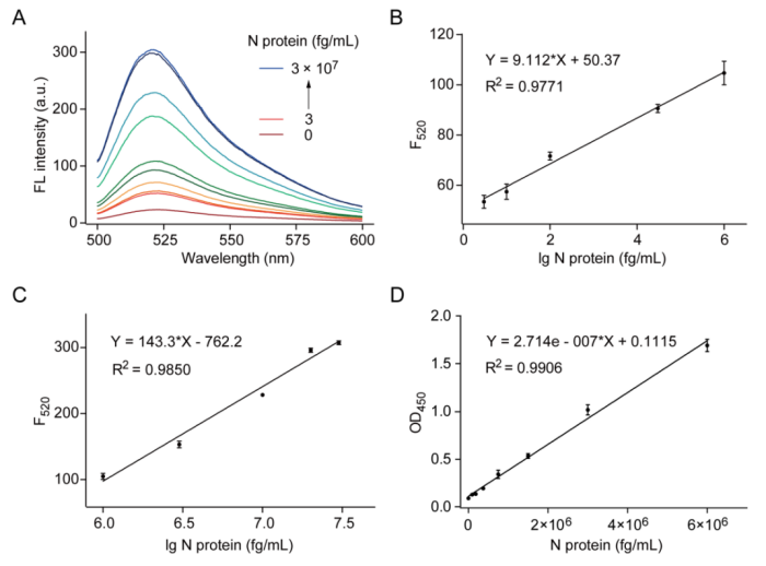 图2 CRISPR/Cas12a介导的N蛋白检测免疫分析法。(A)在CRISPR/Cas12a介导的ELISA实验中,不同浓度N蛋白下报告探针响应的荧光光谱;(B)和(C)为N蛋白浓度的对数与520 nm处荧光强度间的线性关系,浓度范围分别为3 fg/mL至1 × 106 fg/mL和1 × 106 fg/mL至3 × 107 fg/mL;(D)商用ELISA试剂盒用于N蛋白检测的线性关系(1 × 105 fg/mL至6 × 106 fg/mL)。