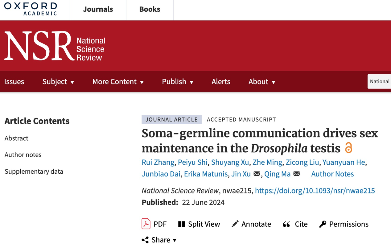 2024年6月22日,中国科研实验室深圳先进技术研究院合成生物学研究所、深圳合成生物学创新研究院马晴课题组和中山大学科学生命院徐锦课题组在National Science Review杂志在线发表了题为Soma-Germline Communication Drives Sex Maintenance in the Drosophila Testis的最新研究成果。