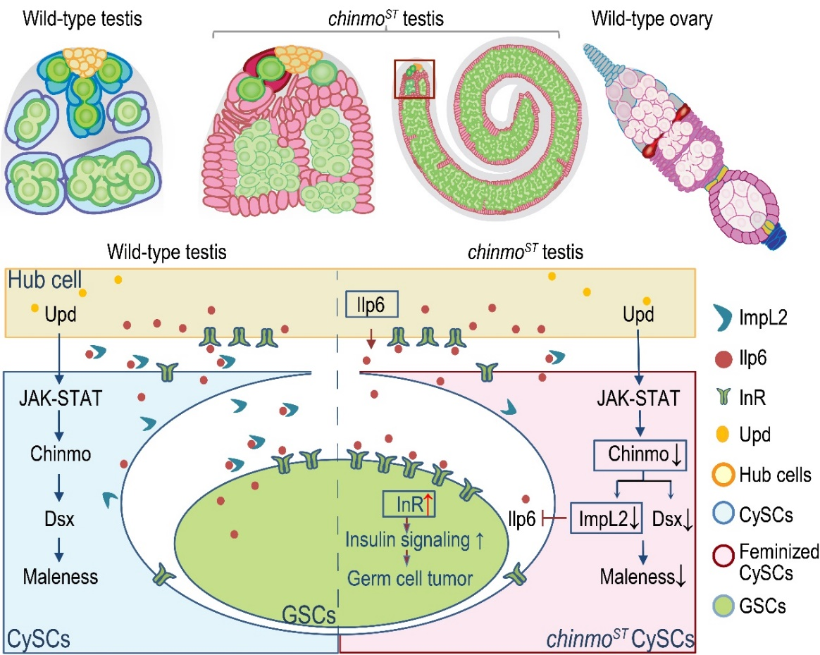 图1:"性别开关"Chinmo受JAK-STAT信号通路的调控,直接作用于雄性性别决定因子DsxM(果蝇中与哺乳动物性别决定因子DMRT1同源的基因)和胰岛素信号通路因子,以维持CySC谱系的雄性身份并促进正常的精子发生。