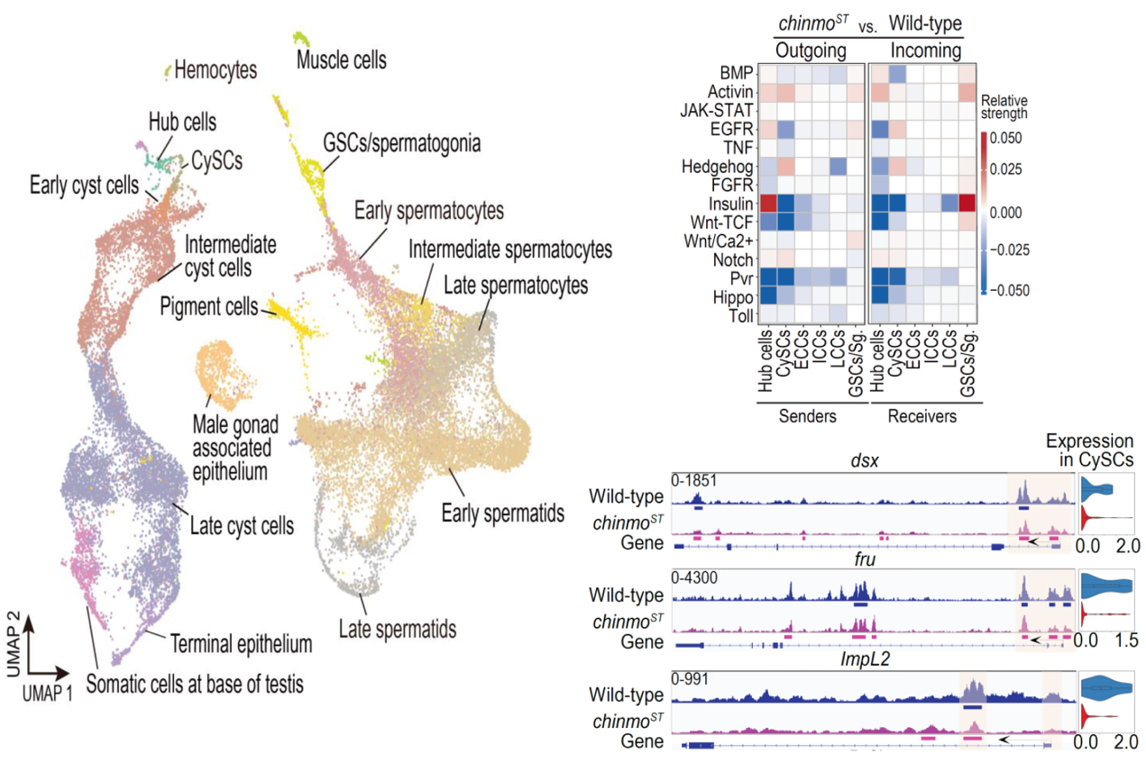 图3:成年果蝇精巢单细胞数据图,精巢细胞间的信号传导,以及Chinmo靶基因示例
