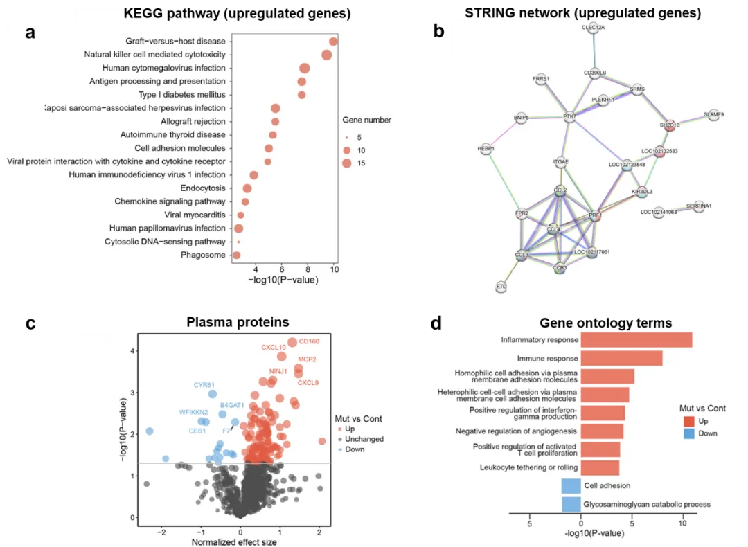 为进一步揭示AD开展进程中的潜在早期分子信号改变,从而为解析早期疾病发生机制、开展早期分子诊断方法给予新的线索,研究团队对幼年食蟹猴进行了血液转录组和血浆蛋白组的检测,结果显示,在幼年AD突变食蟹猴中,其外周血液系统已经开始出现大量炎症和免疫反应相关信号分子的改变(图2),提示早期外周免疫反应异常可能在AD进程中发挥重要作用。