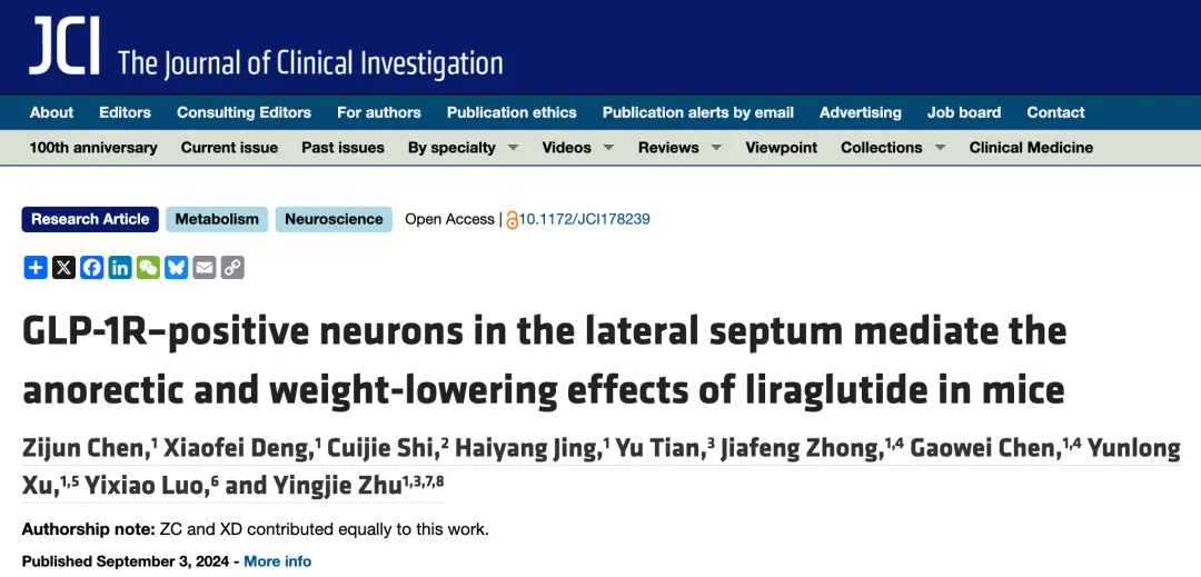 JCI︱朱英杰团队揭示“减肥药”GLP-1R激动剂的全新中枢作用靶点