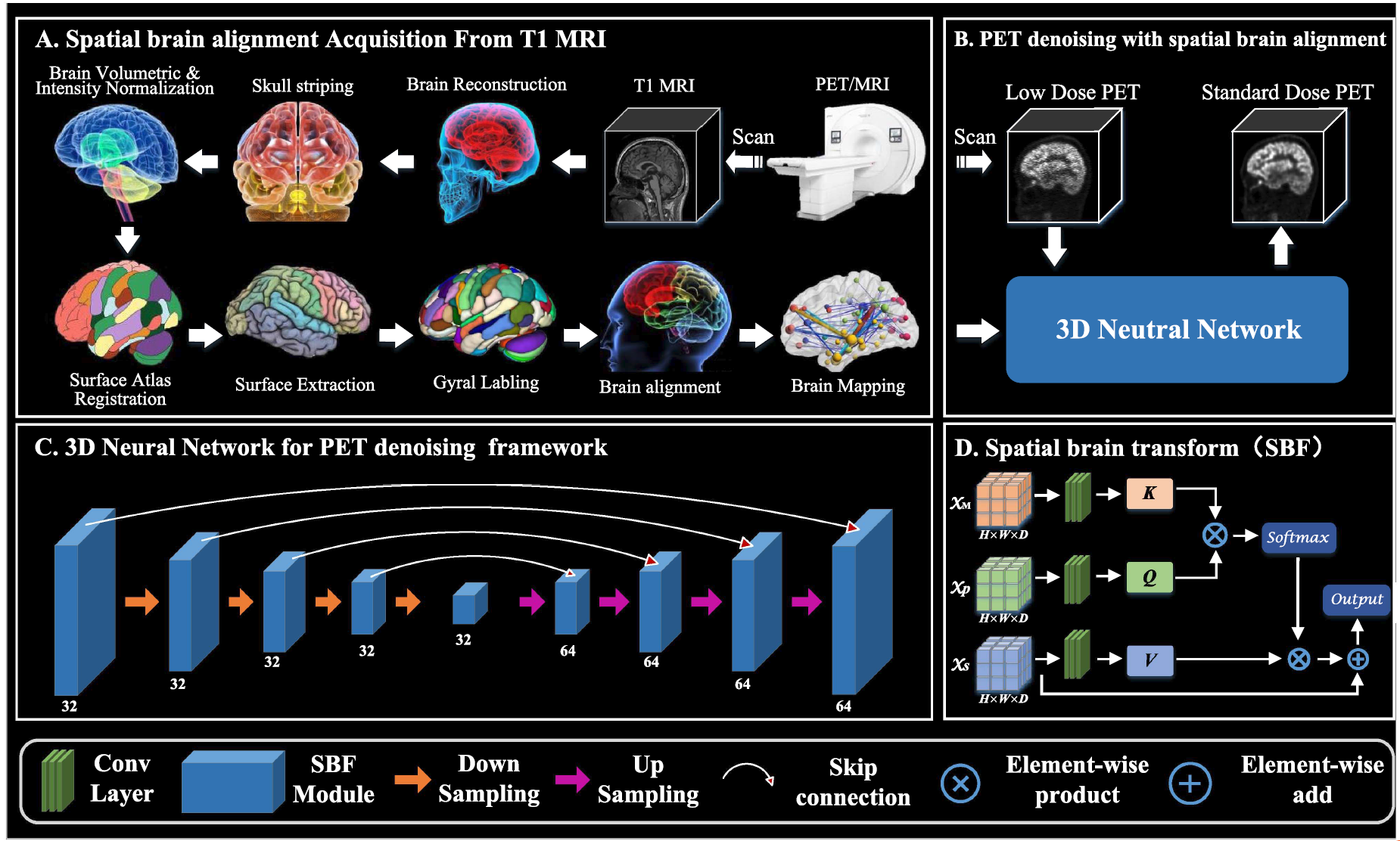 该研究基于一体化PET/MR研发了一种融合空间定位技术的低剂量全脑区PET高清成像技术,旨在低剂量扫描协议下提高全脑区PET的图像质量并降低患者辐射风险。团队基于交叉注意力机制构建3D网络框架,有效融合分析剖结构信息、功能代谢信息和不同脑区空间位置分布,实现了低剂量全脑区PET图像区域性增强。