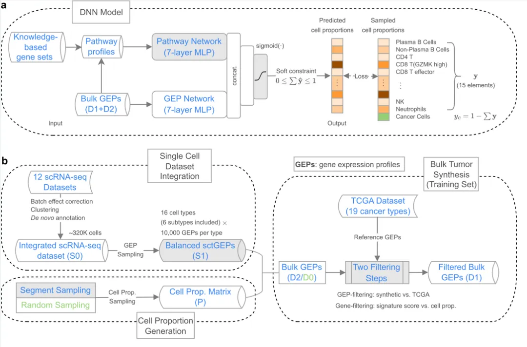 在现有的技术中,流式细胞术和单细胞RNA测序(scRNA-seq)等实验方法能够直接测定肿瘤微环境中的细胞比例,但这些方法通常成本较高。为解决这一问题,研究人员开发了多种计算方法以基于低成本的批量RNA测序(bulk RNA-seq)数据来估算不同类型细胞的比例,例如EPIC、MuSiC、CIBERSORTx、Scaden、Kassandra等。然而,由于不同肿瘤类型中癌细胞的基因表达谱差异很大,使用单一模型精准预测多种肿瘤中各类细胞的丰度仍然是一个挑战。