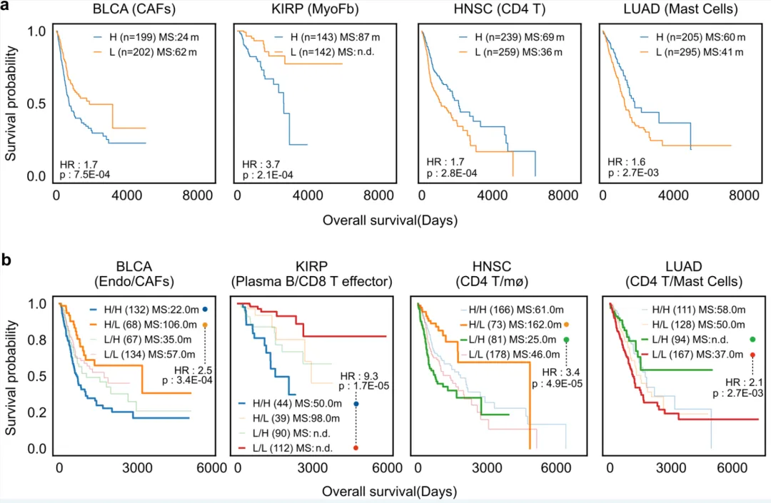 该项研究顺利获得患者生存分析(Survival analysis)探索了DeSide在临床应用中的潜在价值。研究结果表明,基于DeSide预测的细胞比例能够有效的将患者按照病情进展情况进行评估分型,即某些细胞类型或其组合的丰度与患者的生存显著相关(图3)。