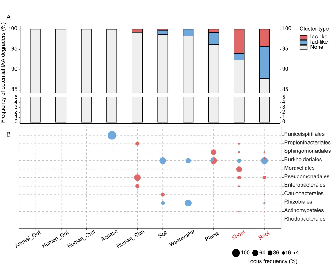 研究团队顺利获得整合分析从不同生态环境收集的宏基因组装基因组(MAGs)及微生物分离株全基因组序列(WGS)中生物标志基因出现的频率,观察到IAA降解菌从水生环境到陆地环境,从土壤基质迈向植物体,并进一步由植物地上部分向根部逐渐增强的定殖偏好性趋势(图4),表明IAA降解菌与IAA生产者(包括植物与IAA合成微生物)之间可能存在密切的关联。