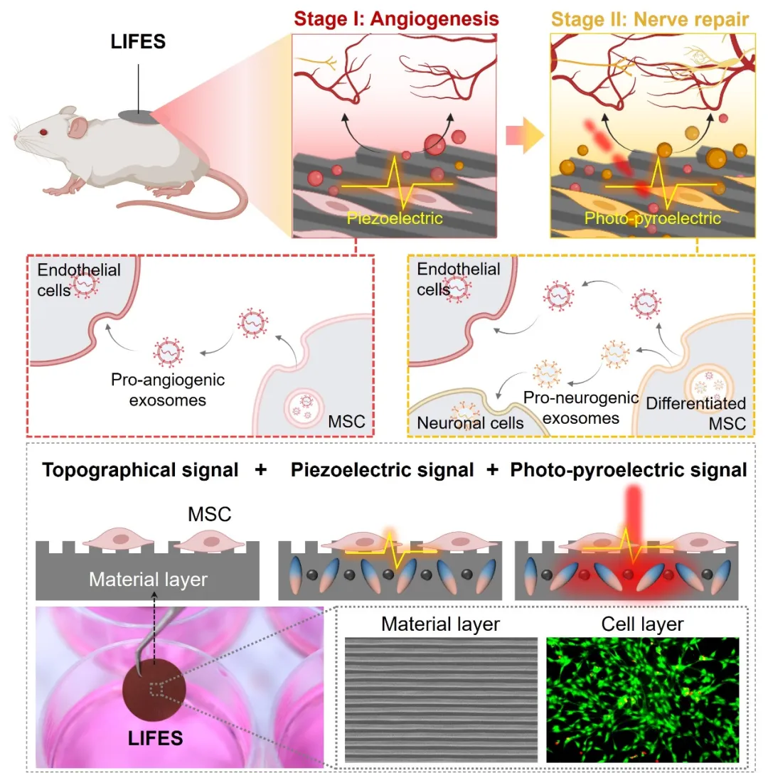 其中复合材料层为具有纳米槽表面拓扑结构的P(VDF-TrFE)基薄膜,可给予用于间充质细胞调控的拓扑、压电和光热释电信号;而间充质干细胞的活细胞层则可实现外泌体的持久分泌。顺利获得复合材料层的拓扑、压电和光热释电信号对间充质细胞形态、分化、电生理响应等行为功能的调控以及对细胞不同信号通路的次序激活,LIFES可实现精准调控的外泌体分泌,重现天然血管神经再生修复生理过程中多靶点、阶段特异的调控作用。