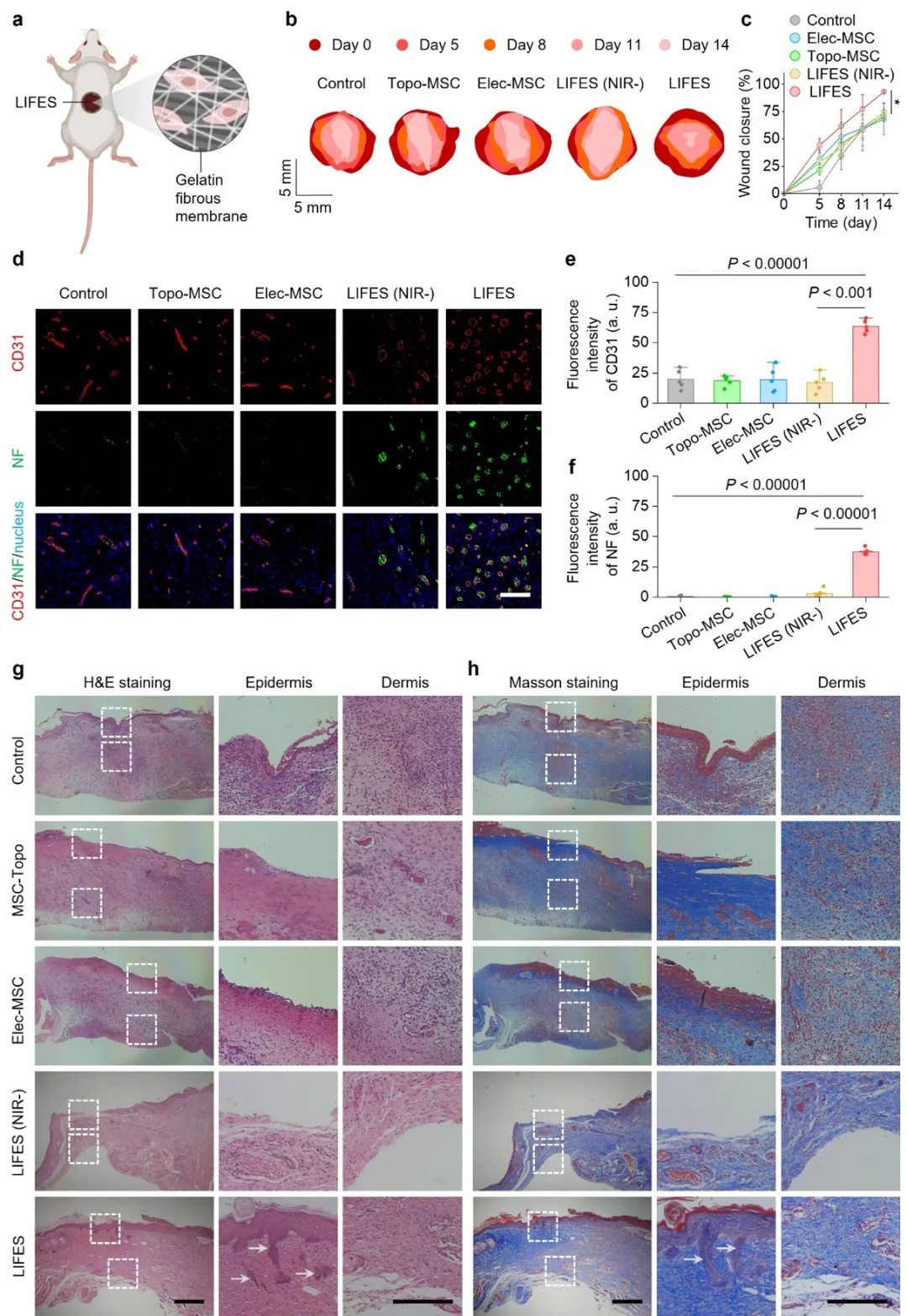 基于此,LIFES不但实现了血管神经在体外的协同修复,并且在大鼠糖尿病伤口模型中,同样展现了卓越的促血管神经协同修复的能力(图2)。本研究提出的LIFES有助于有助于解决血管神经协同修复这一组织工程和再生医学领域的重大难题,有望促进下一代智能生物医用材料与器械的开展。
