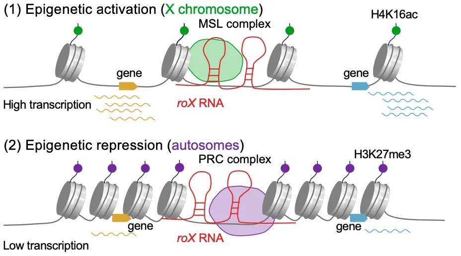 在自然界中,许多动物具有异形的性染色体(如X和Y染色体)。在漫长的进化过程中,一条性染色体(例如Y染色体)逐渐退化,仅保留少量基因,导致性染色体(如X染色体)上很多基因的剂量在不同性别之间存在差异。例如,人类女性有两条X染色体,而男性只有一条X染色体。为了应对这种基因剂量不平衡,很多物种进化出了“性染色体剂量补偿”(sex chromosome dosage compensation)机制,在不同性别间平衡基因表达水平。有趣的是,这些以整条染色体为单位的表观调控机制中,往往有长非编码RNA(lncRNA)的参与。例如,人类和小鼠雌性体内有一种叫做XIST的长非编码RNA,它能使XX雌性细胞中一条X染色体表观失活,相关基因的表达被关闭,而果蝇则顺利获得雄性个体中表达的另一种叫做roX的长非编码RNA实现XY雄性中唯一一条X染色体的表观激活。