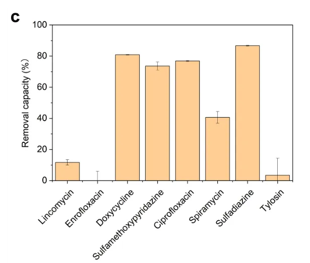 利用定向进化技术,筛选到了新型小球藻(M5)能够快速地去除废水中的总氮(TN),氨氮(NH4-N)和总磷(TP)。在鸭场厌氧废水中实现了 192 mg TN/L/d、177 mg NH4-N/L/d 和 2 mg TP/L/d 的去除率,在养猪场厌氧废水中实现了 160 mg TN/L/d、125 mg NH4-N/L/d 和 6 mg TP/L/d 的去除率 (图1a 和b)。与之前发表的研究相比,在TN含量高出 4 倍的情况下,M5对TN去除率仍旧高出 8 倍 (Wang et al., 2016)。同时,发现M5可有效去除鸭场废水中的强力霉素、磺胺甲氧哒嗪、环丙沙星和磺胺嘧啶(图 1c)。在猪场废水中,也可有效去除磺胺甲氧哒嗪、磺胺二甲嘧啶、强力霉素、土霉素、磺胺间甲氧嘧啶、培氟沙星、金霉素和四环素(图 1d)。