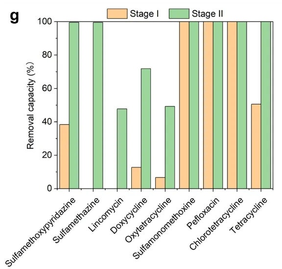 图 2. 陆续在反馈工艺处理畜牧业废水。(a)陆续在反馈系统示意图。处理(b、c)鸭场厌氧消化废水(DFWD)和(d、e)养猪场厌氧消化废水(PWD)后,I 和 II 阶段的细胞密度、化学需氧量(COD)、总氮(TN)、铵氮(NH4-N)和总磷(TP)浓度。从(f)DFWD 和(g)PWD 中抗生素去除率