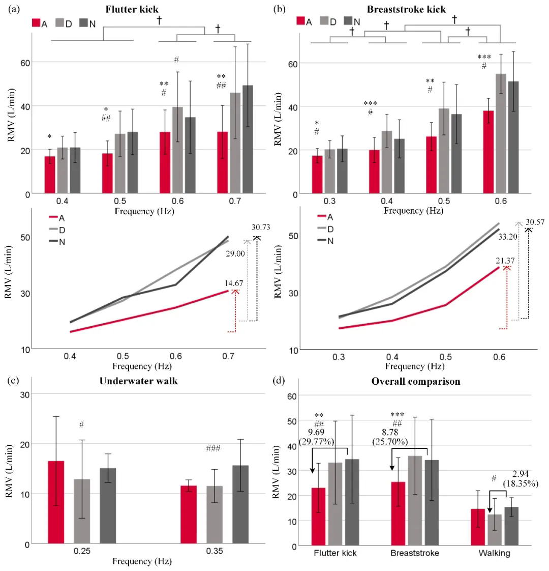 研究团队进行了多项实验,9名参与者在不同的运动模式和频率下进行了测试,结果显示,PEAKED针对水下交替打腿能减少潜水员气瓶内空气消耗速率29.77% ± 7.68%,针对蛙泳打腿降低25.70% ± 5.99%,而在水下行走时降幅为18.35% ± 4.53%。这些数据表明,PEAKED在减少潜水员代谢成本方面具有显著效果,结果还显示,在高频率动作下,其助力效能更为明显。