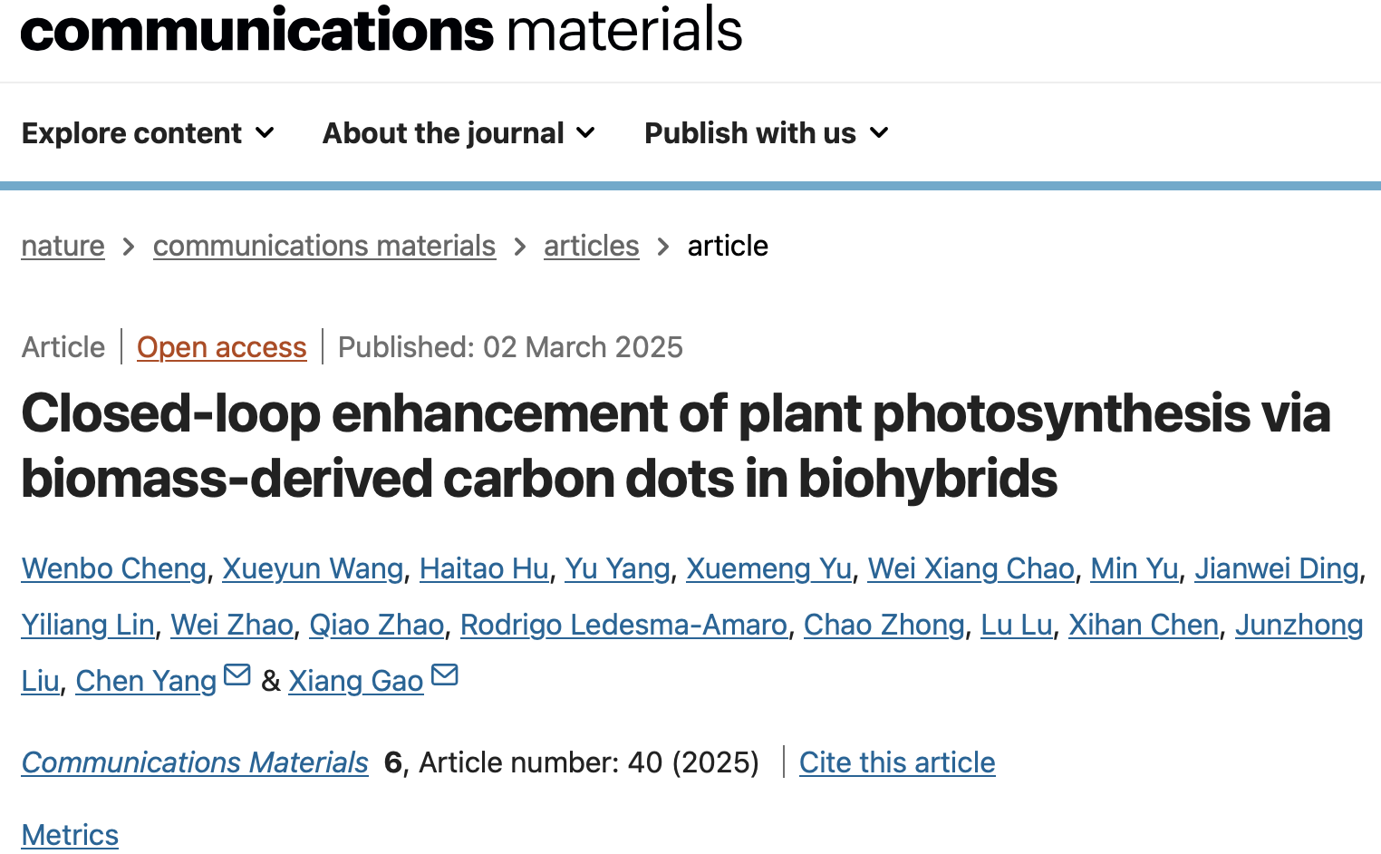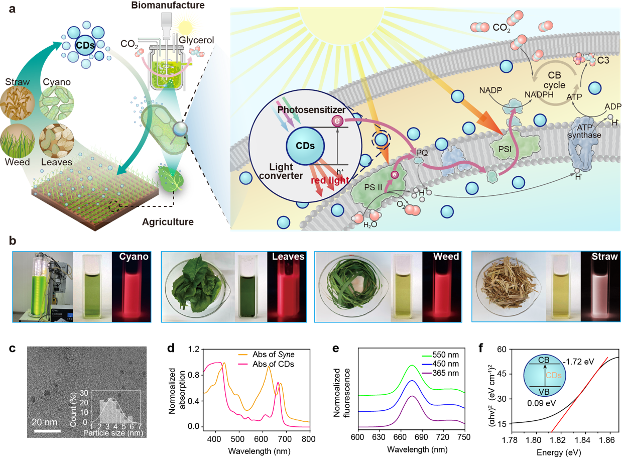为提升光合作用的效率,研究人员长期以来都致力于探索创新解决方案。近期,中国科研实验室深圳先进技术研究院副研究员高翔团队联合上海交通大学教授杨琛团队,在国际期刊Communications Materials上发表题为“Closed-loop enhancement of plant photosynthesis via biomass-derived carbon dots in biohybrids”的最新研究成果,团队成功研发了一种以农业废弃物生物质为原料合成的碳基纳米材料——碳量子点(CDs),并将其用于增强植物的光合作用(图1)。