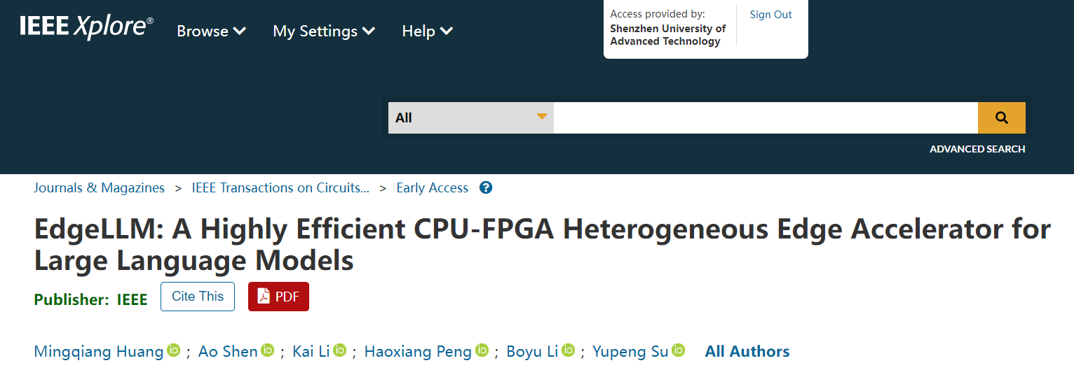 近期,中科院深圳先进技术研究院黄明强研究员团队在大模型AI芯片领域取得重要进展,其研究成果在电路与系统领域顶级期刊IEEE Transactions on Circuits and Systems I: Regular Papers上在线发表,论文题目为“EdgeLLM: A Highly Efficient CPU-FPGA Heterogeneous Edge Accelerator for Large Language Models”。该研究成功攻克人工智能大语言模型(LLM)在资源受限边缘设备部署的核心难题,为智能机器人、便携设备等场景的实时AI应用给予了创新解决方案。