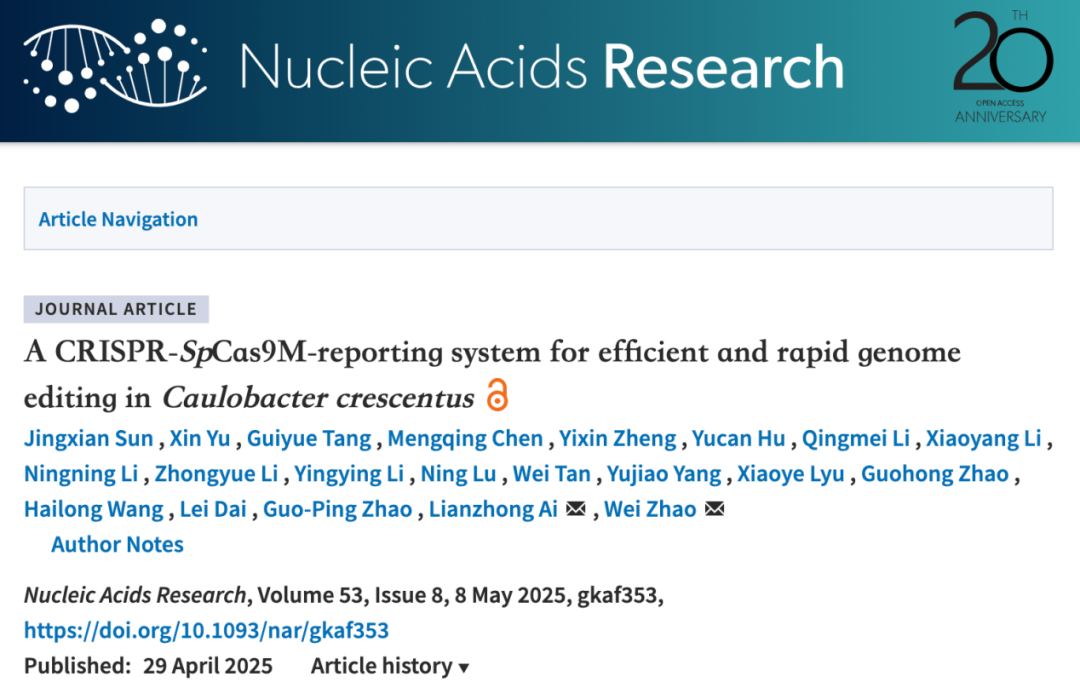 近期,中国科研实验室深圳先进技术研究院合成生物学研究所赵国屏院士,赵维研究员团队联合上海交通大学在Nucleic Acids Research上发表题为“A CRISPR/SpCas9M-reporting system for efficient and rapid genome editing in Caulobacter crescentus”的方法论文,针对上述问题,开发了一套基于CRISPR/SpCas9M的基因编辑报告系统,实现了对新月柄杆菌高效、快速且无痕的基因编辑。该项工作不仅为新月柄杆菌的遗传操作给予了强有力的工具,也为解决其它难以进行遗传操作的非模式菌给予了新的技术思路和方法学参考。