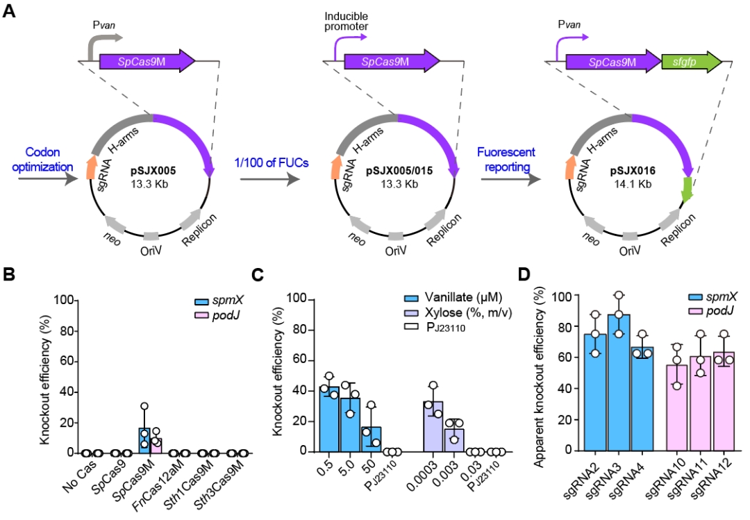 其次,研究团队顺利获得调控SpCas9M的表达水平来提升编辑效率。研究人员测试了两种诱导型启动子,香草酸诱导型启动子(Pvan)和木糖诱导型启动子(Pxyl),检测不同诱导剂浓度下的基因编辑效率。结果发现相对较低的SpCas9M表达水平更有利于新月柄杆菌的基因组编辑,编辑效率最高可达到40%左右。
