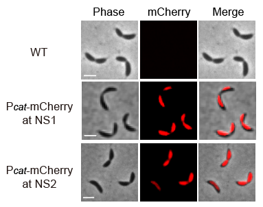 迄今为止,科学家尚未能实现新月柄杆菌中无标记的基因插入。为解决这一难题,研究人员应用CRISPR/SpCas9M-报告系统测试了靶向基因插入的可行性。利用基因敲入进行功能取得性研究时,研究人员选择中性插入位点(Neutral Insertion Site, NIS)以避免基因极性效应。研究人员顺利获得targetFinder鉴定出一组新月柄杆菌潜在中性插入位点,并选取评分最高的NIS位点。当利用CRISPR/SpCas9M-报告系统将Pcat-mcherry敲入到中性位点后,倒置荧光显微镜下可观察到菌株内的mCherry红色荧光信号,证实该基因被正确插入且有效转录翻译。此外,敲入菌株均未检测到明显的生长及形态学改变,表明这些插入位点不会对新月柄杆菌的适应性造成显著影响。