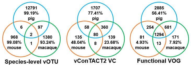 基于以上背景,研究团队以三种模式动物肠道宏基因组数据为研究对象,利用生物信息学方法,从407、980、110个小鼠、猪、食蟹猴肠道宏基因组中挖掘得到977、12896、1480条种水平完整度>=90%的高质量病毒序列,分别构成hcMGV、hcPGV、hcCMGV数据库。经比对发现其中大部分与已知病毒数据库ICTV和IMG/VR相似度较低,属于有尾噬菌体,说明hcMGV、hcPGV、hcCMGV扩展了模式动物肠道中噬菌体的多样性。