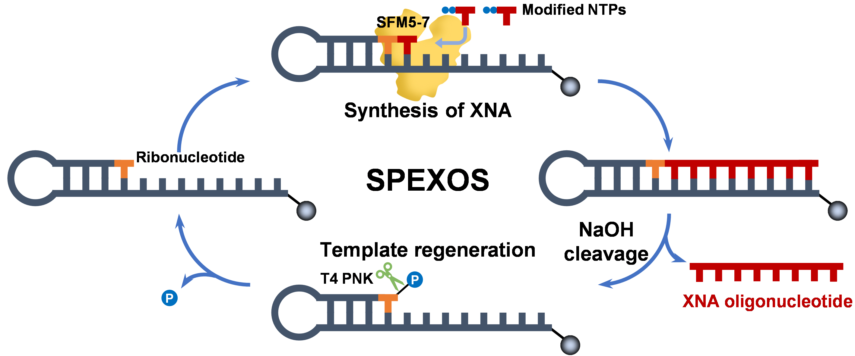 图1. 基于高效非天然核酸聚合酶的固相酶促XNA寡核苷酸合成(SPEXOS)平台