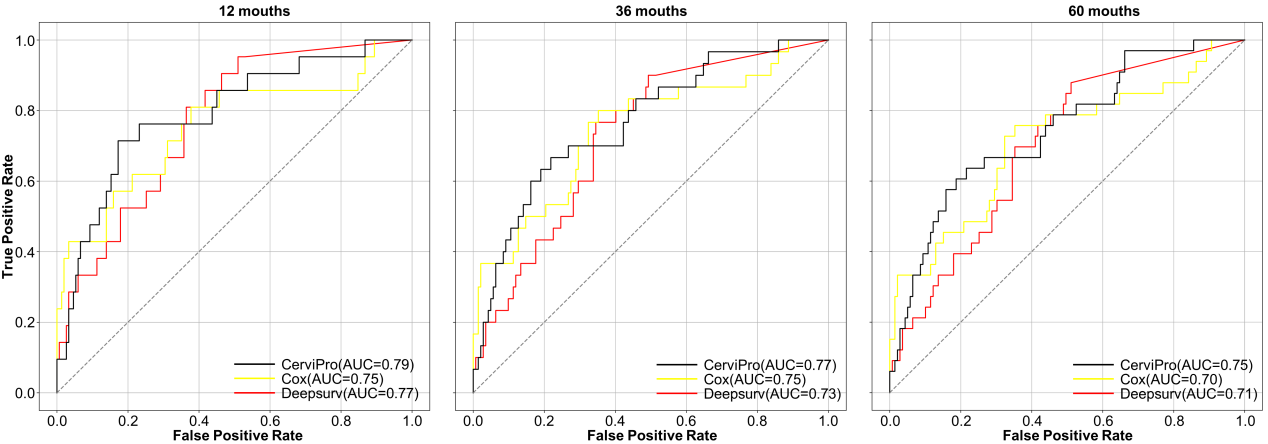 为确保模型的临床实用性,研究团队联合北京协和医院、空军军医大学西京医院、大连医科大学第二附属医院,共同收集了1018例宫颈癌患者的多模临床数据(图3)。顺利获得多中心验证设计,验证了模型不仅在单一医院表现优异,还能适应不同医院的实际临床环境。提出的CerviPro模型的结果表现超越传统Cox模型和DeepSurv模型,体现了整合不同数据源的协同价值,为临床医生精准识别高危患者、制定个体化治疗策略给予了可靠的智能决策工具(图4)。