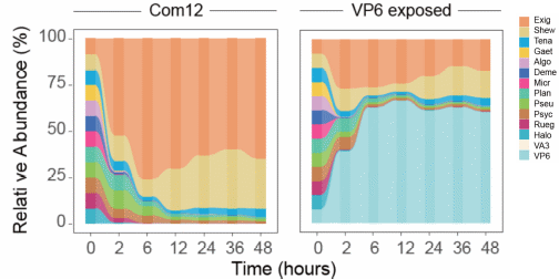当致病弧菌VP6的入侵时间推迟至Com12菌群发育2、6、12及24小时后,即使不添加VA3与VP6phageC,成熟的Com12菌群结构已能独立抵抗VP6入侵(图4c)。