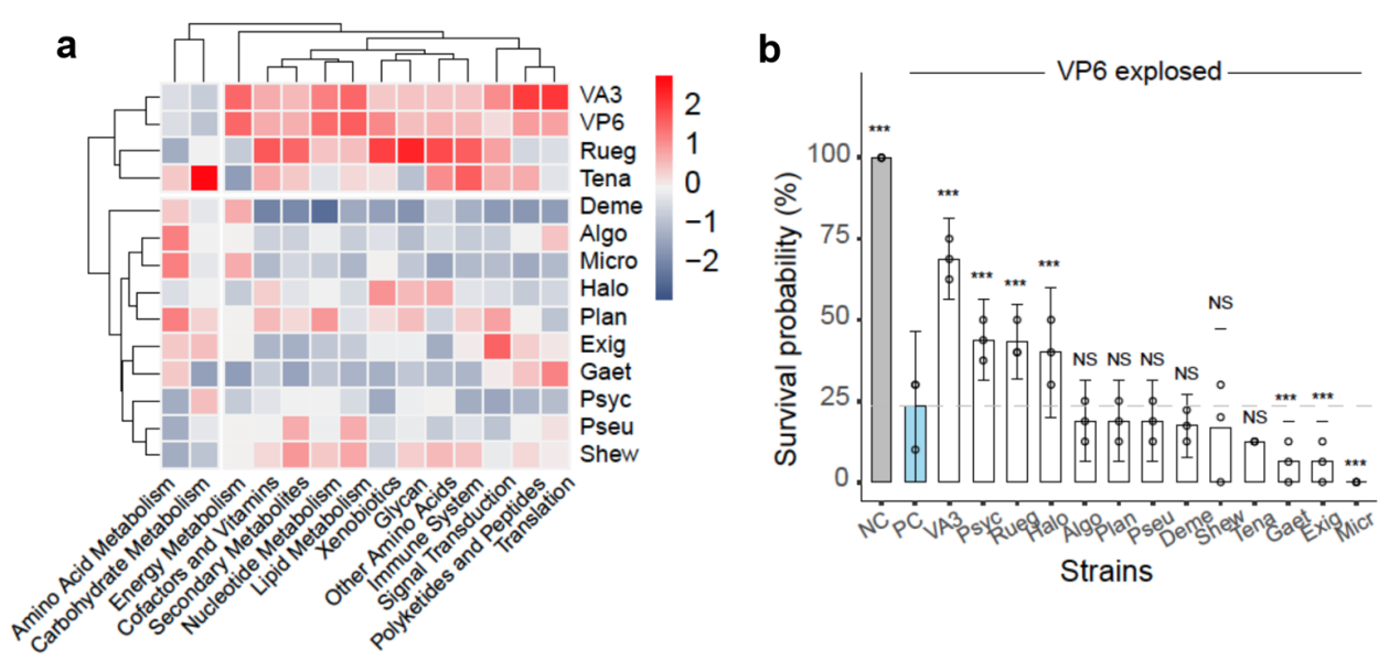 研究团队从健康对虾肠道中分离12株可培养菌株,构建合成菌群Com12。实验发现,单独添加致病性副溶血弧菌VP6会导致对虾死亡,加入Com12后对虾存活率得到一定程度的提升;而当共生弧菌VA3与Com12协同作用时,则可进一步增强VP6感染状态下对虾的生存能力(图1a&b)。这表明肠道共生菌可显著提升对虾抗病能力。
