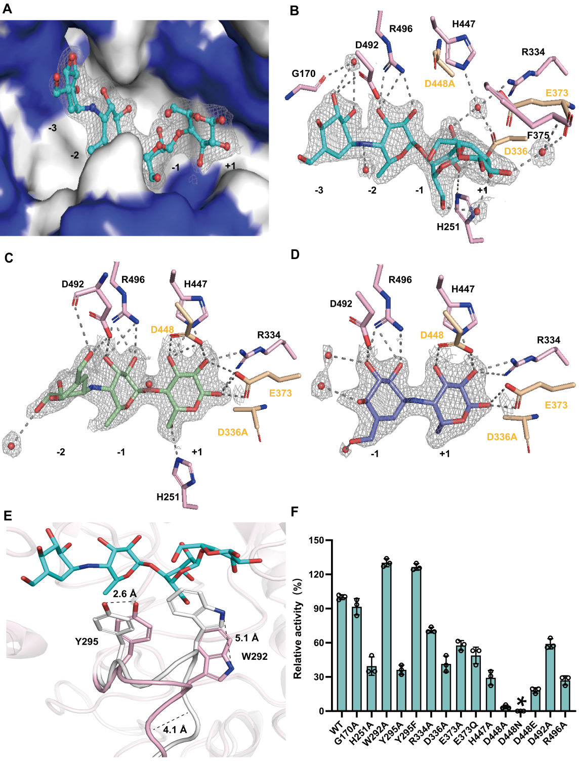 图4 Apg 的复合物结构及突变酶活分析。(A)Apg 活性位点腔内底物阿卡波糖的示意图。(B)Apg(D448A)-阿卡波糖的复合物结构(PDB ID:9IVZ)。(C)Apg(D336A)-M1的复合物结构(PDB ID:9IZE)。(D)Apg(D336A)-M2的复合物结构(PDB ID:9IZO)。(E)Apg(D448A)-阿卡波糖复合物(PDB ID:9IVZ)(残基为粉色)与突变体 Apg(D448A)(PDB 编号:9IXH)的结构叠加(残基为白色)。(F)Apg 活性位点上残基的诱变实验。