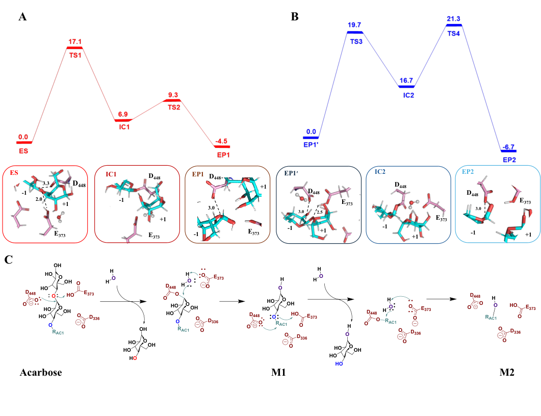 阿卡波糖被Apg水解的最终产物是二环的M2。关于M2是如何产生的,存在疑问:(1)是阿卡波糖直接一步水解成M2和麦芽糖?计算模拟(QM/MM)显示此路径能垒极高(36.9 kcal/mol),且实验中未检测到麦芽糖副产物,排除了此可能性。(2)还是分步水解?晶体实验观察到将Apg与中间产物M1孵育可生成M2。结合动力学和热力学分析发现,Apg对阿卡波糖的亲和力远高于对M1。进一步的自由能计算发现,Apg-阿卡波糖复合物的结合自由能(-20.5 kcal/mol)显著低于Apg-M1(-13.8 kcal/mol)。QM/MM计算显示,从M1水解到M2的能垒(19.7 kcal/mol)高于从阿卡波糖水解到M1的能垒(17.1 kcal/mol)。因此,阿卡波糖被Apg水解是一个明确的两步过程:第一步为阿卡波糖→M1+葡萄糖(相对较快),第二步为M1→M2+葡萄糖(此步是限速步骤,较慢)。