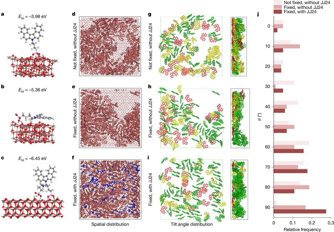该研究中,研究团队设计引入了一种优化了碳链长度的含叠氮基团新型SAM分子JJ24,能够增强主体SAM分子CbzNaph在透明导电氧化物衬底表面的分布均一性,并抑制自组装过程中缺陷和空隙的形成。JJ24分子的含叠氮基团可以顺利获得热激活方式,与CbzNaph分子的烷基链原位共价交联,构成紧密组装的co-SAM层(图1)。这一结构显著增强了CbzNaph的择优取向性(图2),并顺利获得强化CbzNaph分子烷基链连接体刚性,抑制在光照和热应力下因分子摆动而引起的透明导电氧化物衬底表面暴露,防止了钙钛矿层埋底界面分解,并抑制器件界面处的非辐射复合损失(图3)。