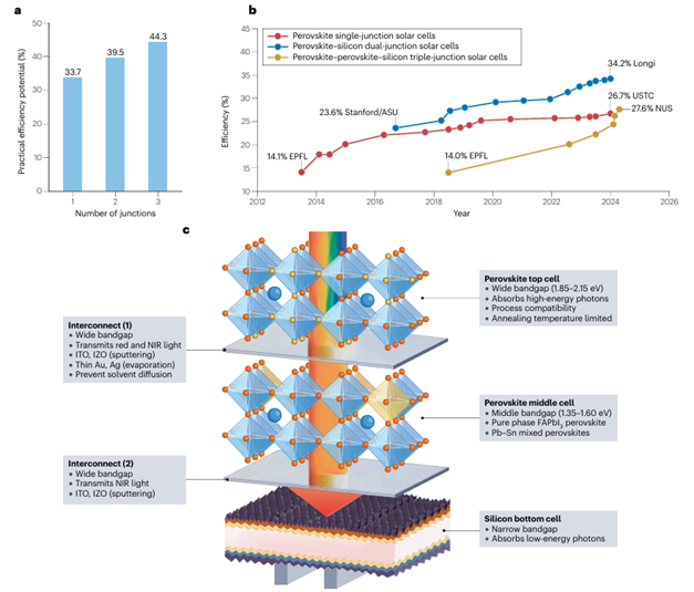 该综述全面梳理了近年来钙钛矿-钙钛矿-硅三结太阳能电池的研究进展,并从材料设计、器件结构和应用潜力三个层面提出了深入分析与展望。