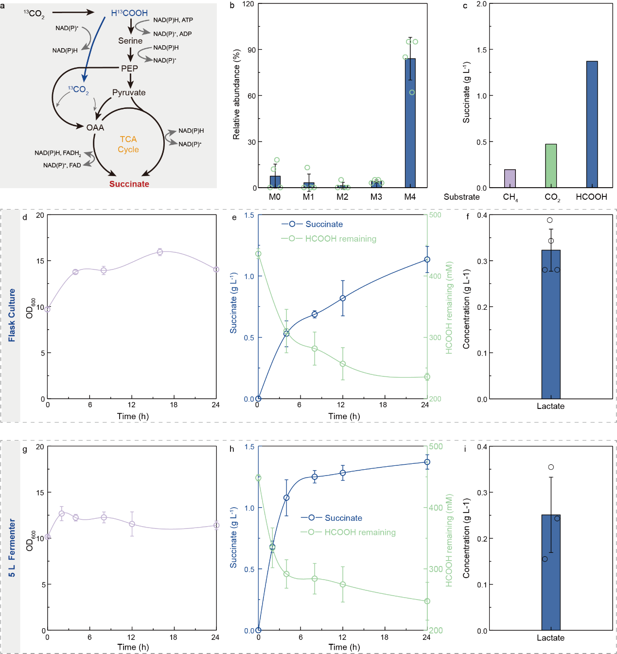 为验证以二氧化碳合成的甲酸作为唯一碳源生产琥珀酸的工业可行性,研究人员系统展示了完整的生产过程:顺利获得碳同位素(13C)标记实验明确证实琥珀酸碳源来自甲酸;在1L与5L发酵罐完成从摇瓶到中试级的放大验证。过程中产生的乳酸产物亦具备材料与化学品价值,提示路线具备并联多产物潜力。结果表明,该系统具备实际放大与产业化可行性,标志着向“边捕碳、边产料”一体化模式迈出关键一步(图6)。