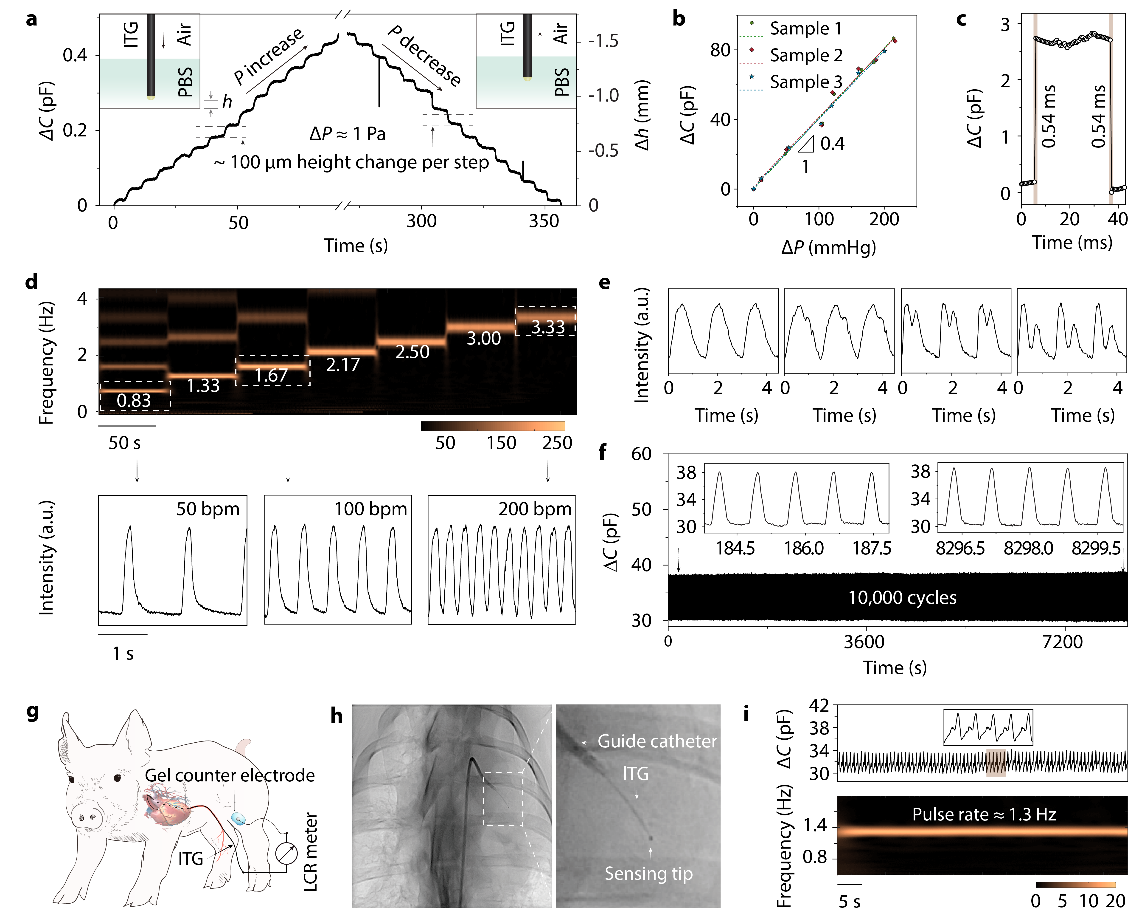 除高操控性外,ITG兼具优异的压力传感性能。在模拟液体环境中,ITG对压力变化呈现线性电容响应,灵敏度达0.39 pF mmHg-1。在 10,000 次循环加载后信号无显著漂移。在猪血管内,ITG 可持续稳定记录真实脉动波形,并对细微波动做出快速响应(图3)