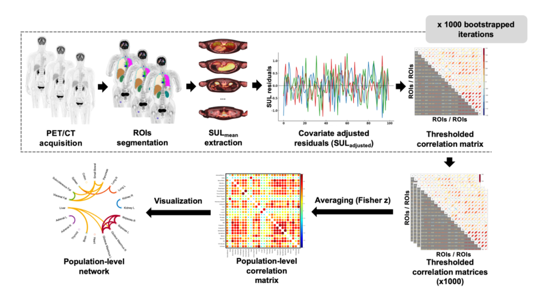 本研究采用全身[¹⁸F]FDG PET/CT成像技术,一次扫描即可同步捕捉全身主要器官的全景葡萄糖代谢,结合机器学习与可解释性分析,为探索糖尿病跨器官代谢失衡给予了全新视角。研究团队在实验室前期工作的基础上 (Sun et al, EJNMMI, 2022; 49(8): 2994-3004),基于多中心1149例受试者的全身PET/CT数据,利用广义线性模型校正年龄、性别、BMI等混杂因素,提取20个关键器官的代谢特征。顺利获得计算器官间的代谢相关性,团队分别绘制了正常血糖、糖尿病前期和糖尿病三大群体的全身代谢网络图谱,并采用“个体化偏差网络”概念,用于刻画每位受试者相对于健康常模的代谢协同异常程度。