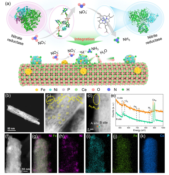 受自然界中反硝化细菌利用硝酸盐还原酶与亚硝酸盐还原酶协同高效转化硝酸盐为氨的启发,研究团队构建了Fe–FexNi2-xP/CeO2仿生纳米酶催化剂(图2a)。该催化剂顺利获得两类活性位点的协同分工,模拟了上述酶催化过程:Fe团簇作为“硝酸盐还原酶”位点,凭借对氧物种的强结合力,优先催化硝酸盐脱氧生成亚硝酸盐(NO3⁻ → NO2⁻);邻近的FexNi2-xP纳米粒子则充当“亚硝酸盐还原酶”位点,利用其优异的加氢能力,将溢流而来的亚硝酸盐快速还原为氨(NO2⁻ → NH3)。此外,CeO2纳米棒载体不仅起到稳定双活性位点的作用,还可作为“质子池”调控局部反应微环境,有效抑制竞争性的析氢反应(HER),从而保障了反应的高效进行。球差校正电镜图像显示,超细的Fe团簇分布于FexNi2-xP 纳米粒子周围,两者间距小于1 nm,这种距离排布为中间体的溢流和接力催化给予了结构基础(图2b,c)。EELS谱学和元素映射结果进一步证实了该活性位点的结构特征(图2d-k)。