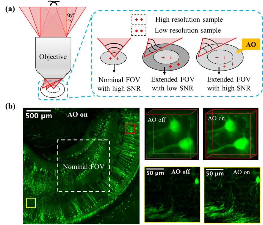 针对这一问题,姚靖、叶世蔚等人提出了一种有效自适应光学方法,可以矫正在大扫描角度时(大视场成像)离轴像差,从而突破物镜的标定视场限制,在仅集成商用光学元件的基础上就实现了视场直径可达3.5 mm维持着800 nm横向分辨率的双光子成像。