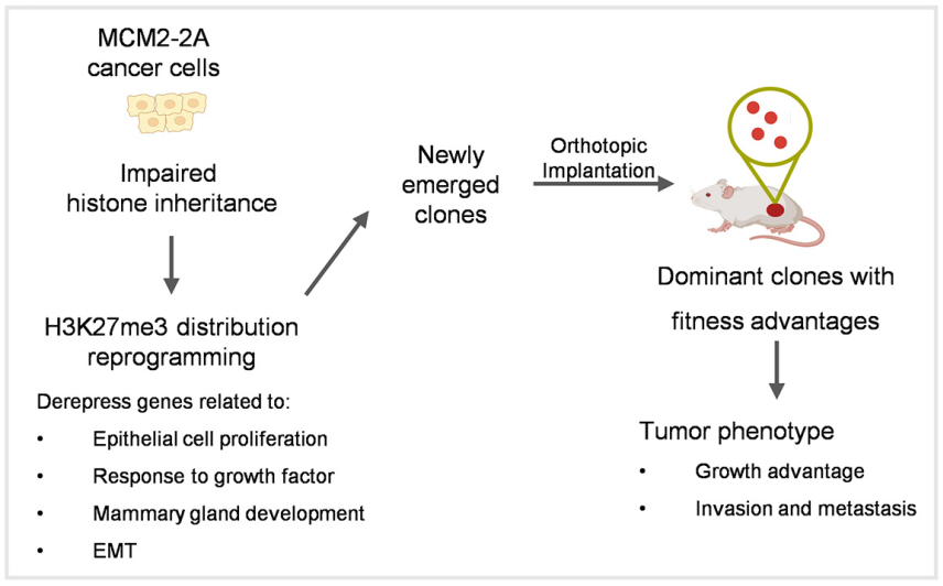 在染色质复制的过程中,亲代组蛋白被复制体分开,而携带表观信息的组蛋白H3-H4四聚体不会分开,并可以被MCM2-POLA1轴或POLE3/4回收到新合成的DNA链上,这使得染色质状态得以在子细胞中维持。研究团队和其他实验室的既往研究发现破坏MCM2与组蛋白结合的结构域或敲除POLE3可以导致小鼠胚胎干细胞和酵母的亲代组蛋白传递失常,但其在肿瘤细胞中是否发挥相似的功能尚不清楚,组蛋白的遗传在肿瘤发生开展中角色也尚不为人所知。