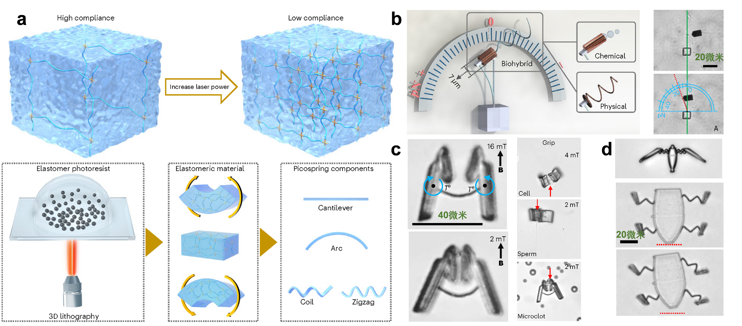 弹簧是人类认识的最早的能量转换器件。小至钟表、扭秤,大至汽车悬挂、原子力显微镜,无一不是使用弹簧组织作为其关键部件而来。可以说弹簧丰富了人造机械的多样性。在微观世界中,细胞和微生物也使用弹性组织来执行力感知、捕食、驱动等动作。把弹簧的应用推广到微观世界,而发明出具备弹簧组织的微纳器件是人类长久以来的一大构想。虽然弹簧的应用历史悠久,但能应用于细胞力学的大应变微米弹性器件却面临挑战。其关键困难在于细胞相容性弹性材料的高精度3D加工。此前,徐海峰团队分别开发了弹簧触发的抗癌精子机器人以及抗血栓的精子火车机器人。研究发表在ACS NanoAngewandte Chemie等顶级期刊,被Science、MIT Technology Review、美国国家广播电视等多家期刊和媒体报道(链接见文末)但前期的微米机器人的力感知精度较差,且无法达成细胞的自由操纵。