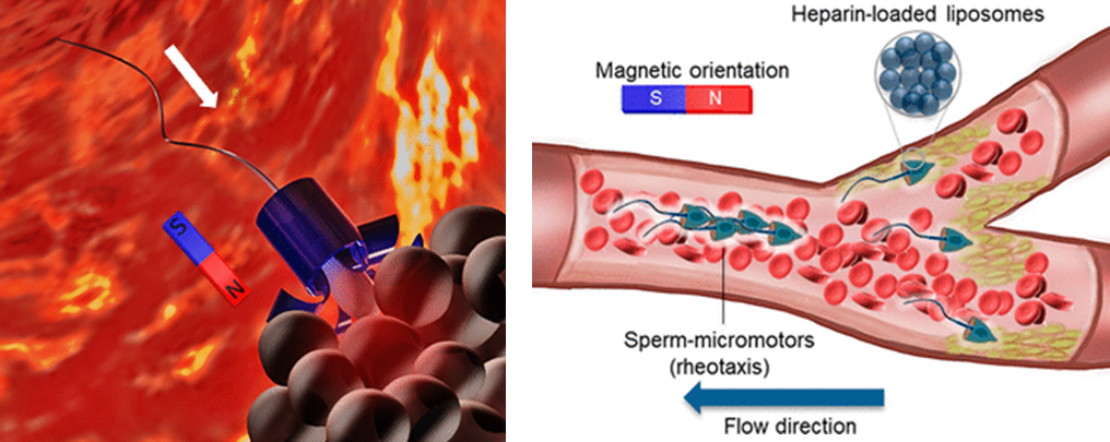 徐海峰开发的两种精子机器人:抗癌四足精子机器人(左)和抗血栓精子火车机器人(右)。