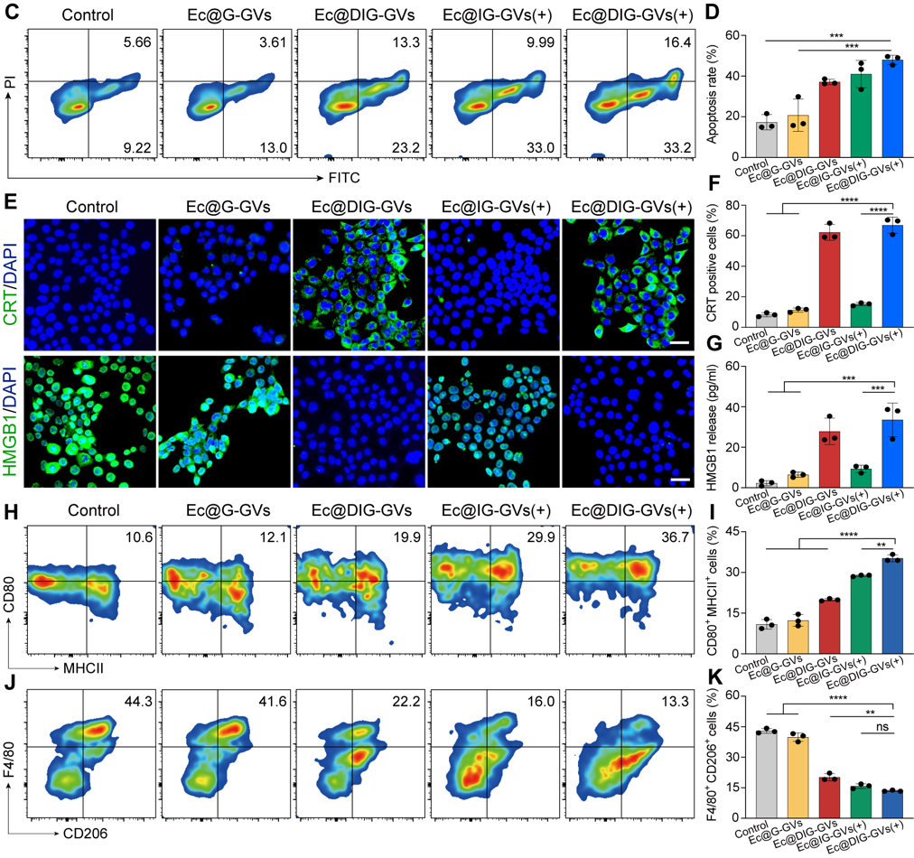 随后,研究团队测试了Ec@DIG-GVs的肿瘤细胞杀伤活性和免疫激活的情况,将Ec@DIG-GVs进行酸性处理并给予hHIFU辐照诱导IFN-γ的表达,离心去除细菌后取得了含有DOX和IFN-γ的上清液。将该上清液与肿瘤细胞孵育后,可见肿瘤细胞发生明显的凋亡和免疫原性死亡(CRT、HMGB1蛋白标志物的检测)。将该上清液与巨噬细胞共孵育后发现M1型巨噬细胞占比明显增加,说明Ec@DIG-GVs所释放的IFN-γ和DOX具有杀伤肿瘤并能诱导M1型巨噬细胞极化(图3)。